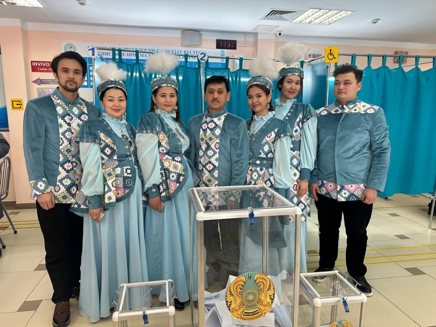 На избирательный участок прибыл фольклорно-инструментальный ансамбль «Жаркаин сазы" в национальных костюмах.